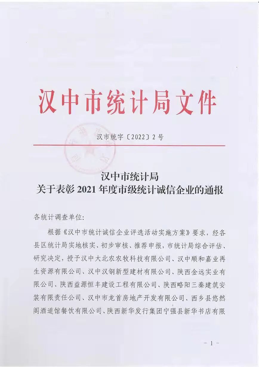 漢中順和嘉業再生資源有限公司被評為2021年度 “漢中市統計誠信企業”